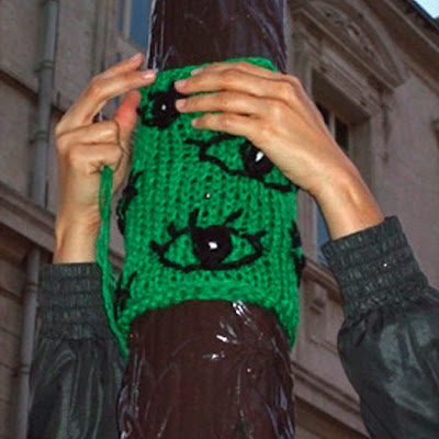 Cuando pensé que ya lo había visto todo, en cuanto a arte urbano, llegan, y me rompen los esquemas, un grupo llamado "Knitta Please", que se dedica a tricotar, si, tricotar, y que se ha lanzado a las calles para abrigarlas con coloristas y “abrazables” graffitis. Sus intervenciones cálidas y suaves consisten en envolver mobiliario urbano, estructuras o estatuas con prendas, de las que cuelgan tarjetas con la leyenda “I love Knitta”.